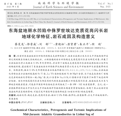地球科学学院地质学专业2022级硕士研究生蔡昊龙在中文核心期刊《地球科学与环境学报》发表题为“东海盆地丽水凹陷中侏罗世埃达克质花岗闪长岩地球化学特征、岩石成因及构造意义”的研究论文。长江大学地球科学学院为论文第一署名单位,硕士研究生蔡昊龙为论文第一作者,刘彬教授为通讯作者。