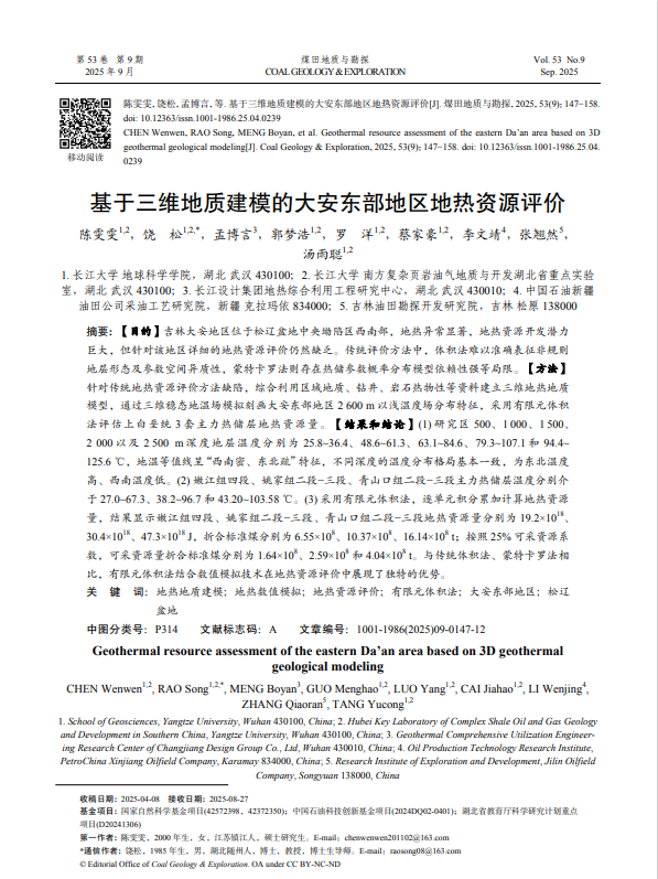 地科学院硕士生陈雯雯在饶松教授的指导下,在期刊《煤田地质与勘探》上发表题为“基于三维地热地质建模的大安东部地区地热资源评价”的研究论文,长江大学地球科学学院为论文第一署名单位,硕士生陈雯雯为论文第一作者,其导师饶松教授为该文通讯作者。