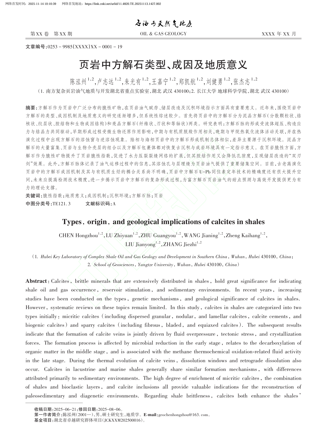 近日,地科学院2024级地质学专业硕士生陈泓州以第一作者身份在中文EI检索期刊《石油与天然气地质》(影响因子7.149)上发表题为“页岩中方解石类型、成因及地质意义”的研究论文。长江大学地球科学学院为论文第一署名单位,硕士生陈泓州为论文第一作者,其导师朱光有教授为论文通讯作者。