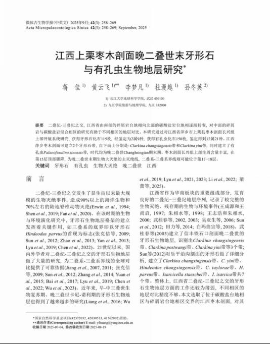 地球科学学院黄云飞教授团队长期从事古-中生代之交重大地质转折期生物灭绝与生物复苏方面的研究,团队成员蒋佳在古生物学领域核心期刊《微体古生物学报》上发表题为“江西上栗枣木剖面晚二叠世末牙形石与有孔虫生物地层研究”的研究论文。长江大学地球科学学院为论文第一署名单位,研究生蒋佳为论文第一作者,黄云飞教授为该文通讯作者,本项研究得到国家自然科学基金项目(42372032, 42030513, 41562002)资助。