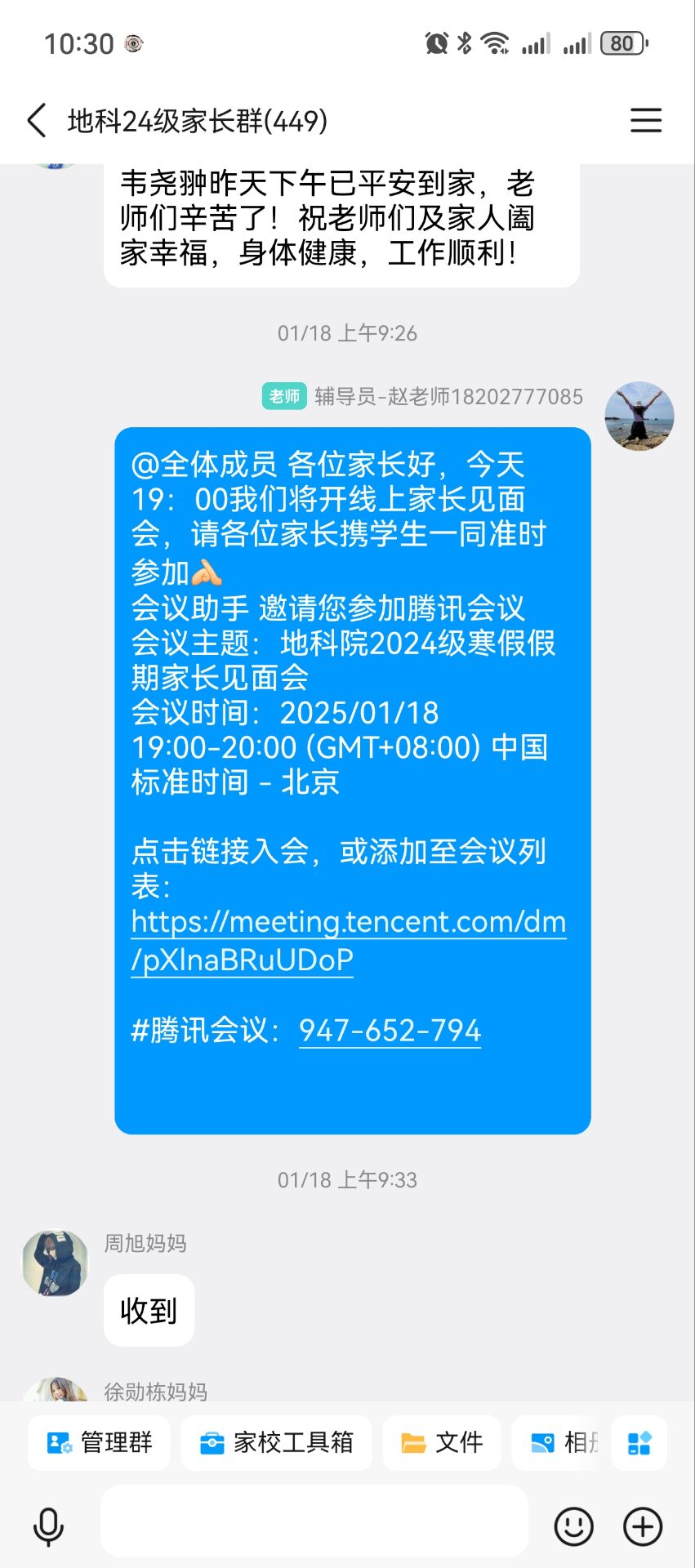 (通讯员 郭禹)为进一步加强家校沟通,凝聚育人合力,我院于1月18日晚7点,24级本科生辅导员赵娥老师通过腾讯会议的形式,组织召开了2024年秋季学期未线上家长会。会议围绕上学期工作总结、假期安全提示与新学期展望三个方面展开,重点强调了“家校协同育人”的重要性。