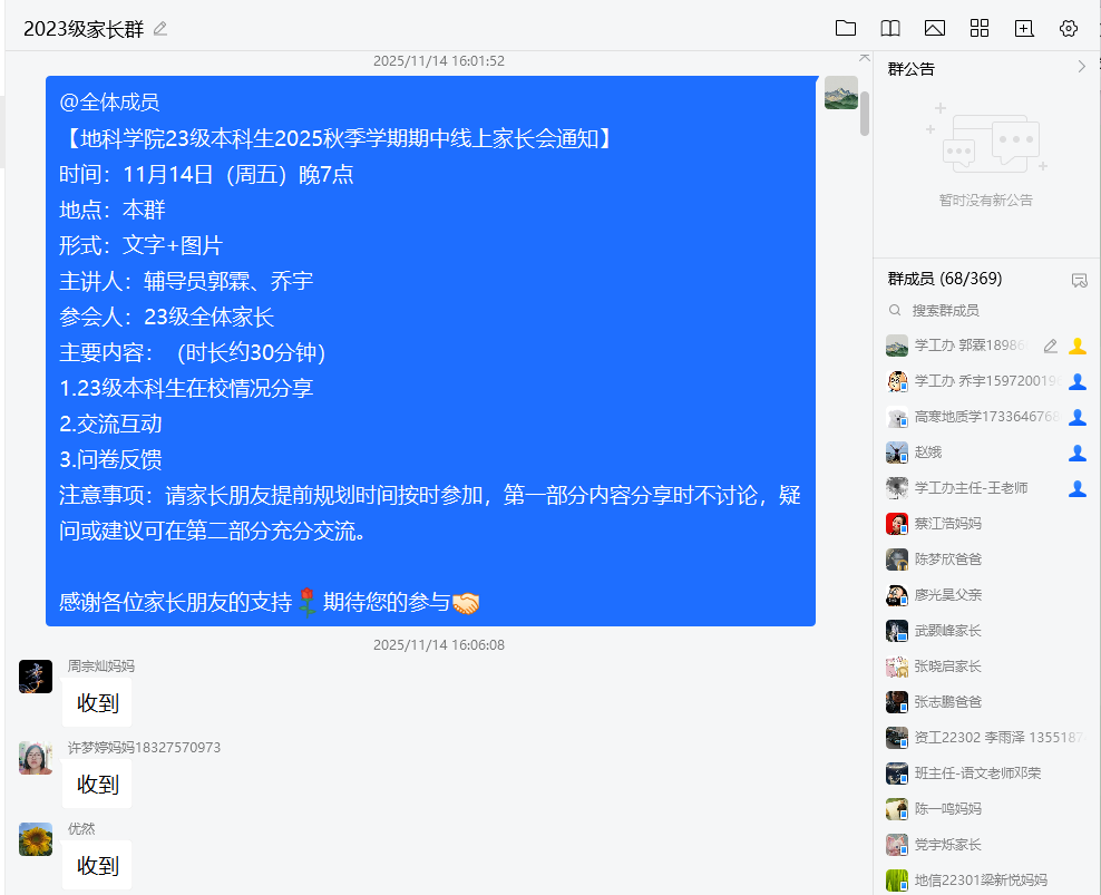 (通讯员 高寒)11月14日晚7点,我院23级本科生本学期期中线上家长会顺利开展。会议由辅导员郭霖和乔宇两位老师主讲,全体23级家长参与。会议以“文字+图片”的形式,聚焦学生学业发展、生涯规划与心理健康等核心议题,旨在深化家校协同育人,共同助力学生成长。