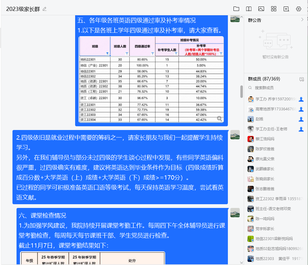 此次家长会涵盖多方面内容:通报上学年各类先进集体及个人、奖助学金评定及党员发展情况;说明科创竞赛成果、英语四级通过率、课堂考勤与学业预警情况;介绍宿舍检查、心理健康教育工作;分析考研与就业形势,给出规划建议。会议重点介绍了23级学生现阶段发展特点,提醒家长关注学生进入大三后的学业压力与生涯选择。 两位老师建议家校协同引导学生理性评估自我,科学规划未来,学院也将持续提供考研辅导、就业指导与心理支持。
