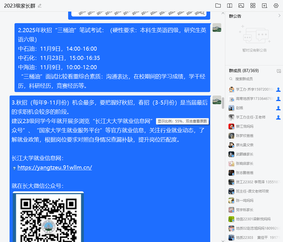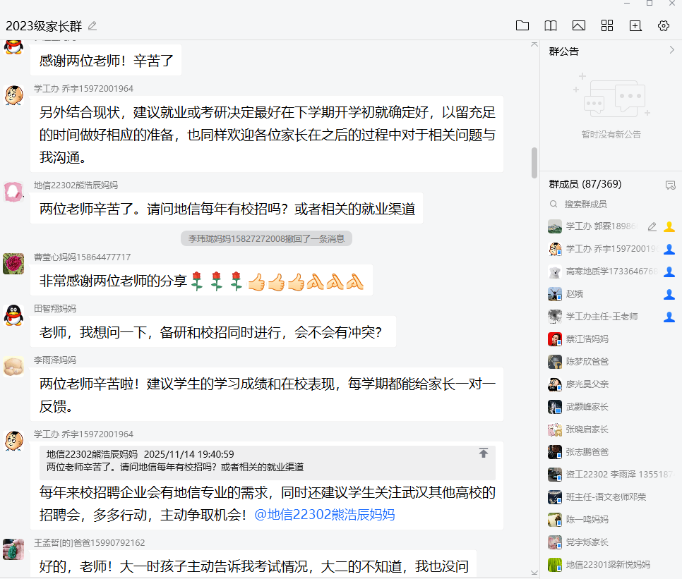 在交流答疑环节,对家长们比较聚焦的考研与就业问题,两位老师均一对一进行了详细回答。会后,面向全体家长发放了我院“家校协同育人”项目家长满意度线上调研问卷,旨在更精准地把握家庭关切,优化沟通渠道,形成育人合力。学院将认真梳理问卷反馈,作为后续工作的重点参考。